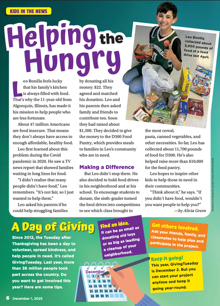 Scholastic News • 1st December 2025 Helping the Hungry Leo Bonilla feels lucky that his family’s kitchen is always filled with food. That’s why the 11-year-old from Algonquin, Illinois, has made it his mission to help people who are less fortunate.
