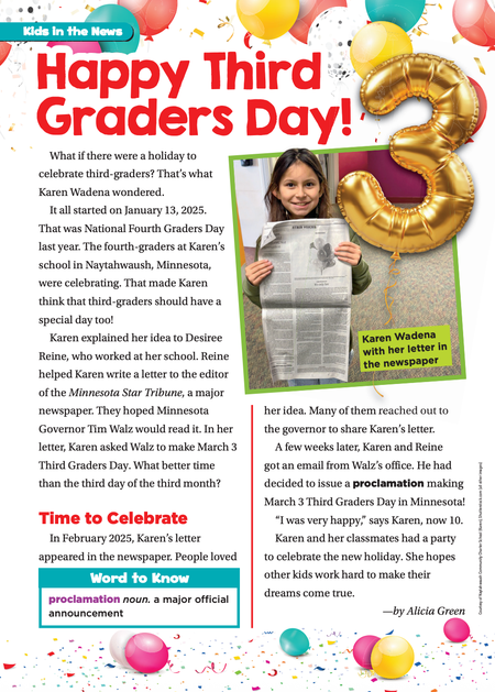 Scholastic News • 16th February 2026 Happy Third Graders Day! What if there were a holiday to celebrate third-graders? That’s what Karen Wadena wondered.