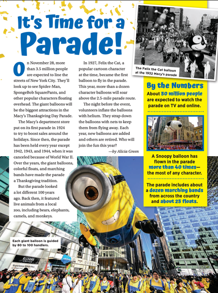 Scholastic News • 18th November 2024 It's Time for a Parade! On November 28, more than 3.5 million people are expected to line the streets of New York City. They’ll look up to see Spider-Man, SpongeBob SquarePants, and other popular characters floating overhead. The giant balloons will be the biggest attractions in the Macy’s Thanksgiving Day Parade.