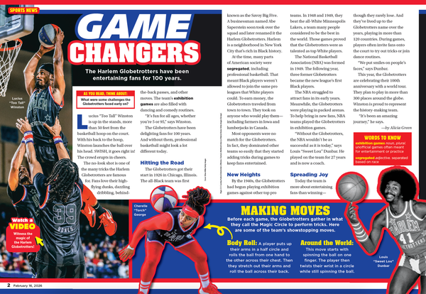 Scholastic News • 16th February 2026 Game Changers Lucius “Too Tall” Winston is up in the stands, morethan 50 feet from the basketball hoop on the court. With his back to the hoop, Winston launches the ball over his head. SWISH, it goes right in! The crowd erupts in cheers.