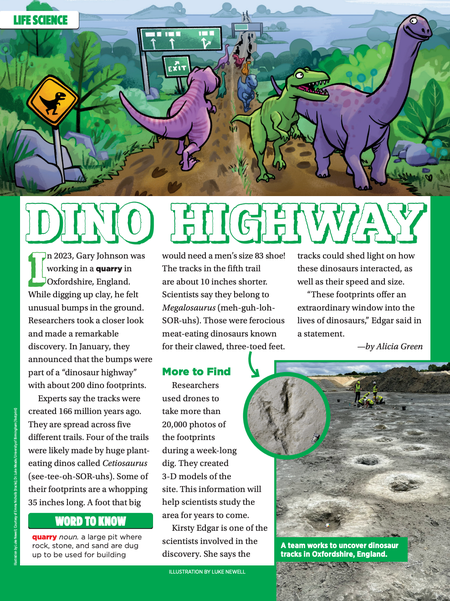 Scholastic News • 31st March 2025 Dino Highway In 2023, Gary Johnson was working in a quarry in Oxfordshire, England. While digging up clay, he felt unusual bumps in the ground. Researchers took a closer look and made a remarkable discovery. In January, theyannounced that the bumps were part of a “dinosaur highway” with about 200 dino footprints.