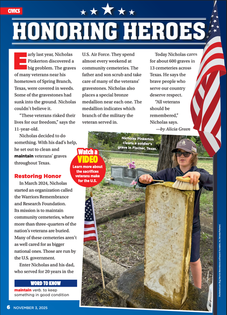 Scholastic News • 3rd November 2025 Honoring Heroes Early last year, Nicholas Pinkerton discovered abig problem. The graves of many veterans near his hometown of Spring Branch, Texas, were covered in weeds. Some of the gravestones had sunk into the ground. Nicholas couldn’t believe it.