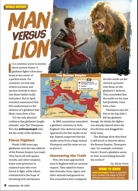 Scholastic News • 29th September 2025 Man Versus Lion It’s a common scene in movies about ancient Rome: A gladiator fights a ferocious beast in the center of a packed arena.