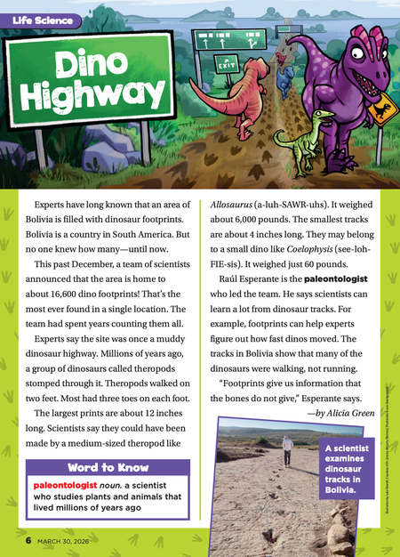 Scholastic News • 30th March 2026 Dino Highway Experts have long known that an area of Bolivia is filled with dinosaur footprints. Bolivia is a country in South America. But no one knew how many—until now.
