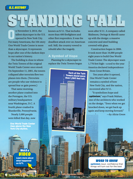 Scholastic News • 9th September 2024 Standing Tall On November 3, 2014, the tallest skyscraper in the U.S. opened in New York City. For many Americans, the 104-story One World Trade Center is more than a skyscraper. It represents hope after one of the darkest days in our nation’s history.