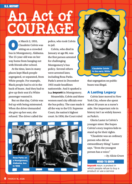 Scholastic News • 16th March 2026 An Act of Courage On March 2, 1955, Claudette Colvin was sitting on a crowded bus in Montgomery, Alabama. The 15-year-old was on her way home from hanging out with friends after school.