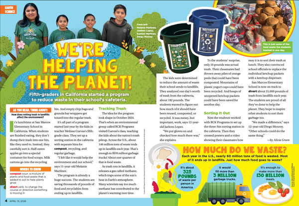 Scholastic News • 13th April 2026 We're Helping the Planet! Fifth-graders in California started a programto reduce waste in their school’s cafeteria.