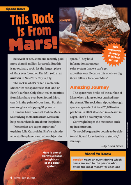 Scholastic News • 29th September 2025 This Rock Is From Mars! Believe it or not, someone recently paid more than $5 million for a rock. But this is no ordinary rock. It’s the largest piece of Mars ever found on Earth! It sold at an auction in New York City in July.