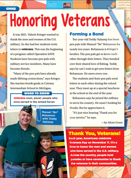 Scholastic News • 4th November 2024 Honoring Veterans It was 2021. Valerie Krieger wanted to thank the men and women of the U.S. military. So she had her students write letters to veterans. This was the beginning of a program called Operation SAVE. Students have become pen pals with military service members. Many have become friends.