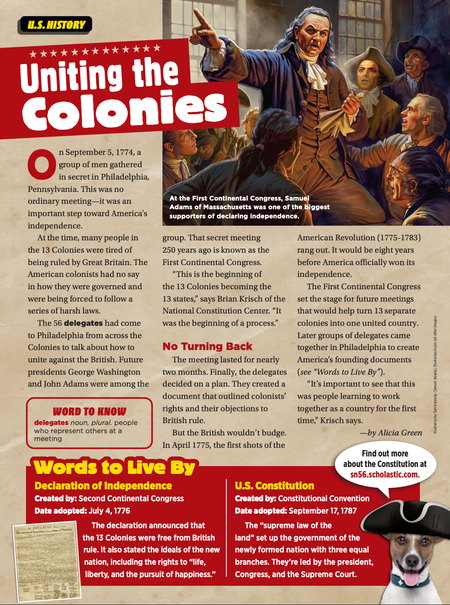 Scholastic News • 16th September 2024 Uniting the Colonies On September 5, 1774, a group of men gathered in secret in Philadelphia, Pennsylvania. This was no ordinary meeting—it was an important step toward America’s independence.