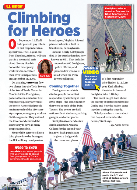 Scholastic News • 8th September 2025 Climbing for Heroes On September 11, Karli Buhr plans to pay tribute to first responders in a special way. The 11-year-old from Thatcher, Arizona, will take part in a memorial stair climb. Events like this honor the emergency workers who sacrificed their lives to help others on September 11, 2001.